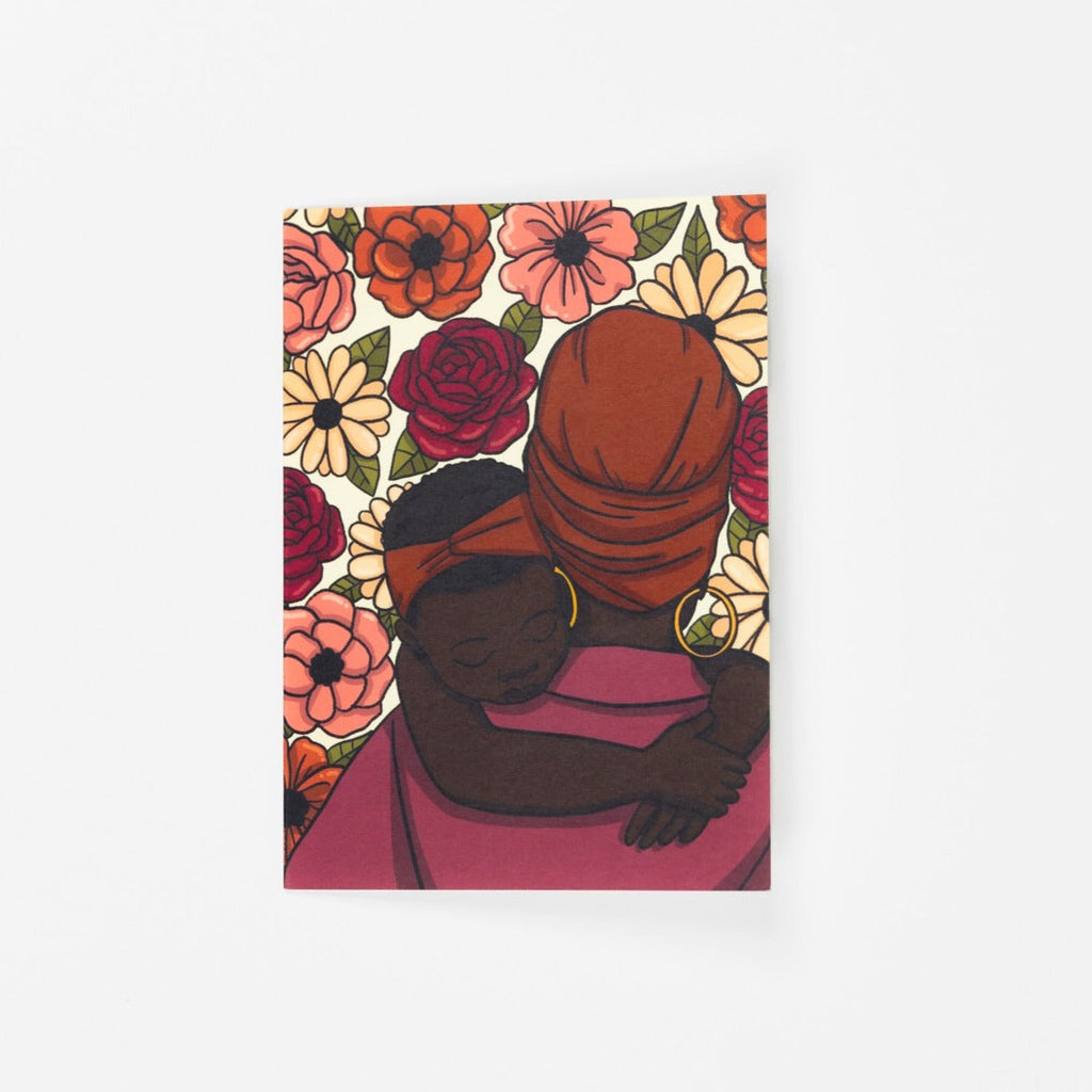 This greeting card features a Black mother embracing her child in matching headwraps with pink and red flowers surrounding them. Celebrate self-care, sisterhood, motherhood, and the joys of the season with this uplifting greeting card! It's the perfect reminder to savor the simple, special moments that make life truly special. Let's make it a Black Girl Summer year round!