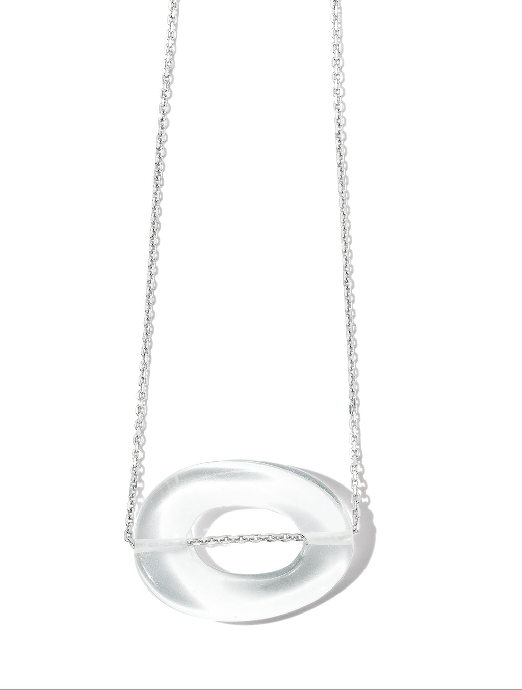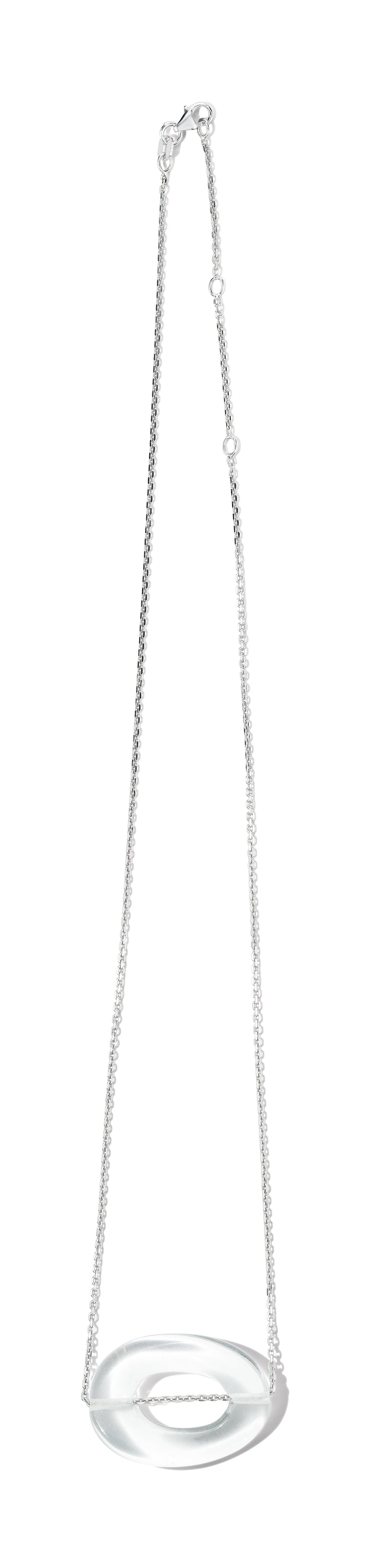 Hand carved Rock Crystal Oval pendant floating on dazzling 1.4 mm diamond cut sterling silver necklace.