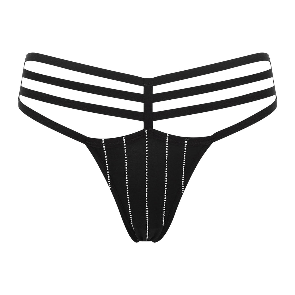 Black strappy thong embellished with crystal pinstripes.
