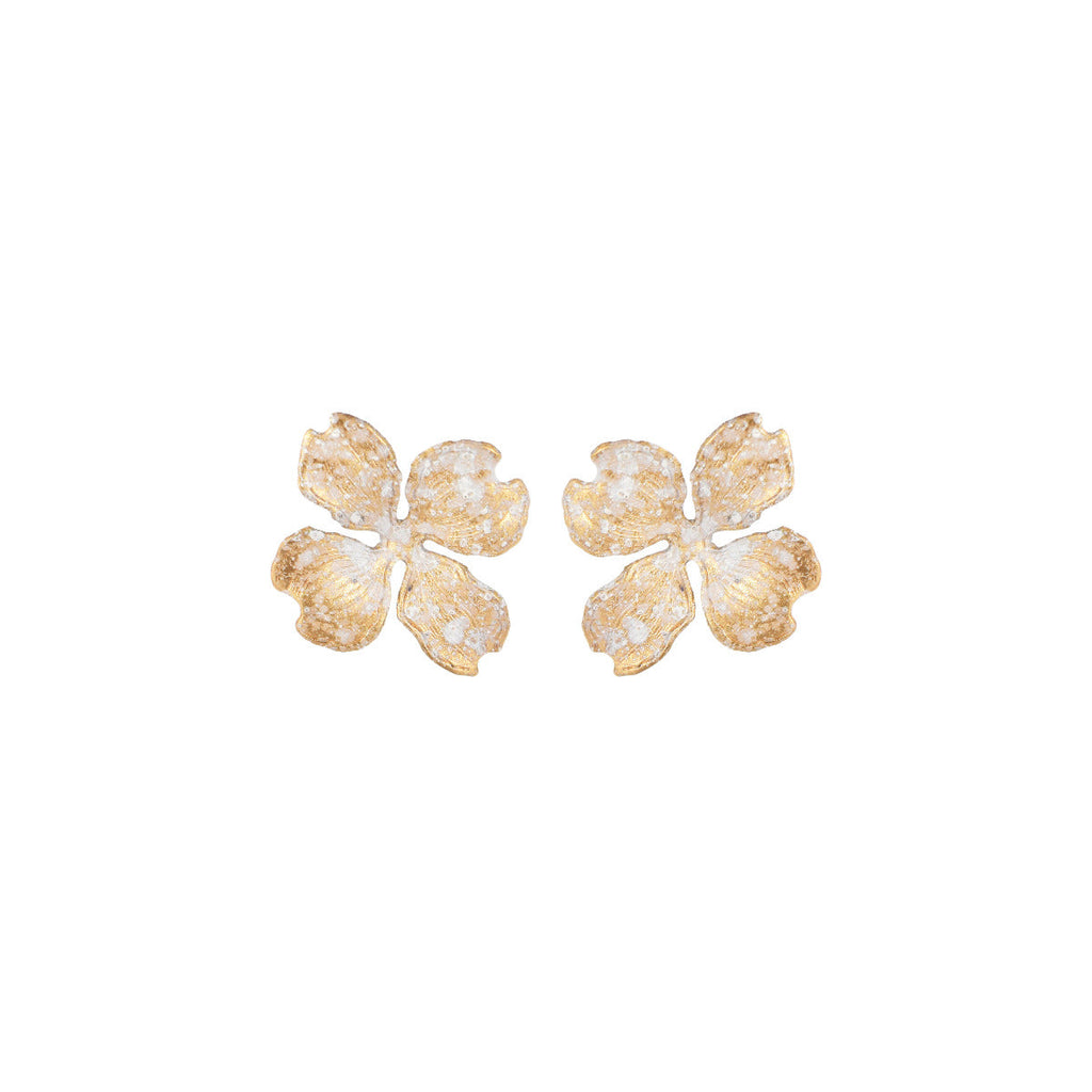 Washes of white pigment add an organic glow to golden brass. Sterling silver posts.