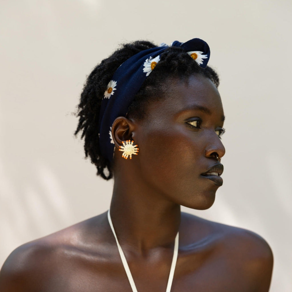 Featuring a blue and white daisy print on one side and a blue palm leaf print on the other, this breathable double-sided headband is summer in an accessory. Tie it around your head or ponytail to add spice to a simple look, or tie it around your headband for those moments where you need your hair back and don’t have a ponytail on hand!