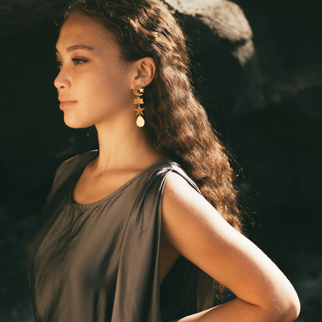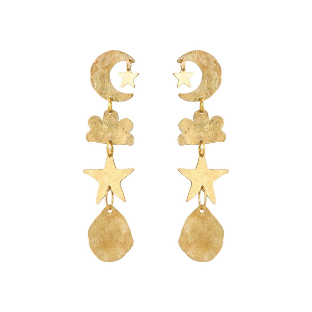 A shower of celestial shapes in hand-hammered brass. Sterling silver posts. Nickel and lead free.