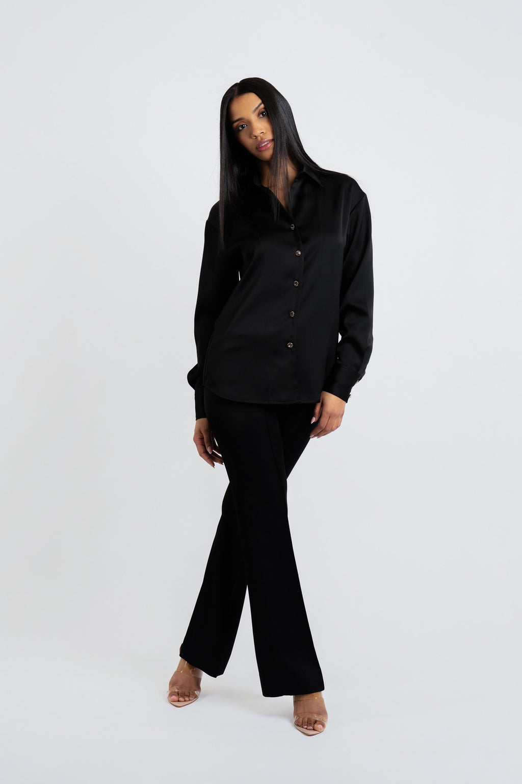 Featuring a sleek, button-down satin shirt with a relaxed fit and matching high-waisted, wide-leg trousers, this ensemble exudes modern elegance. The lustrous fabric offers a luxurious sheen, draping beautifully for a polished yet effortless look. Styled with a printed neck scarf for a touch of Parisian glamour, this set is versatile enough for day-to-night wear.