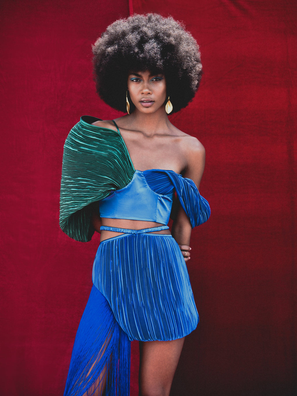 - Sculptural fit, high rise, layered look, cutout hips, pleated mini skirt, trailing fringe side, mini hem, lined