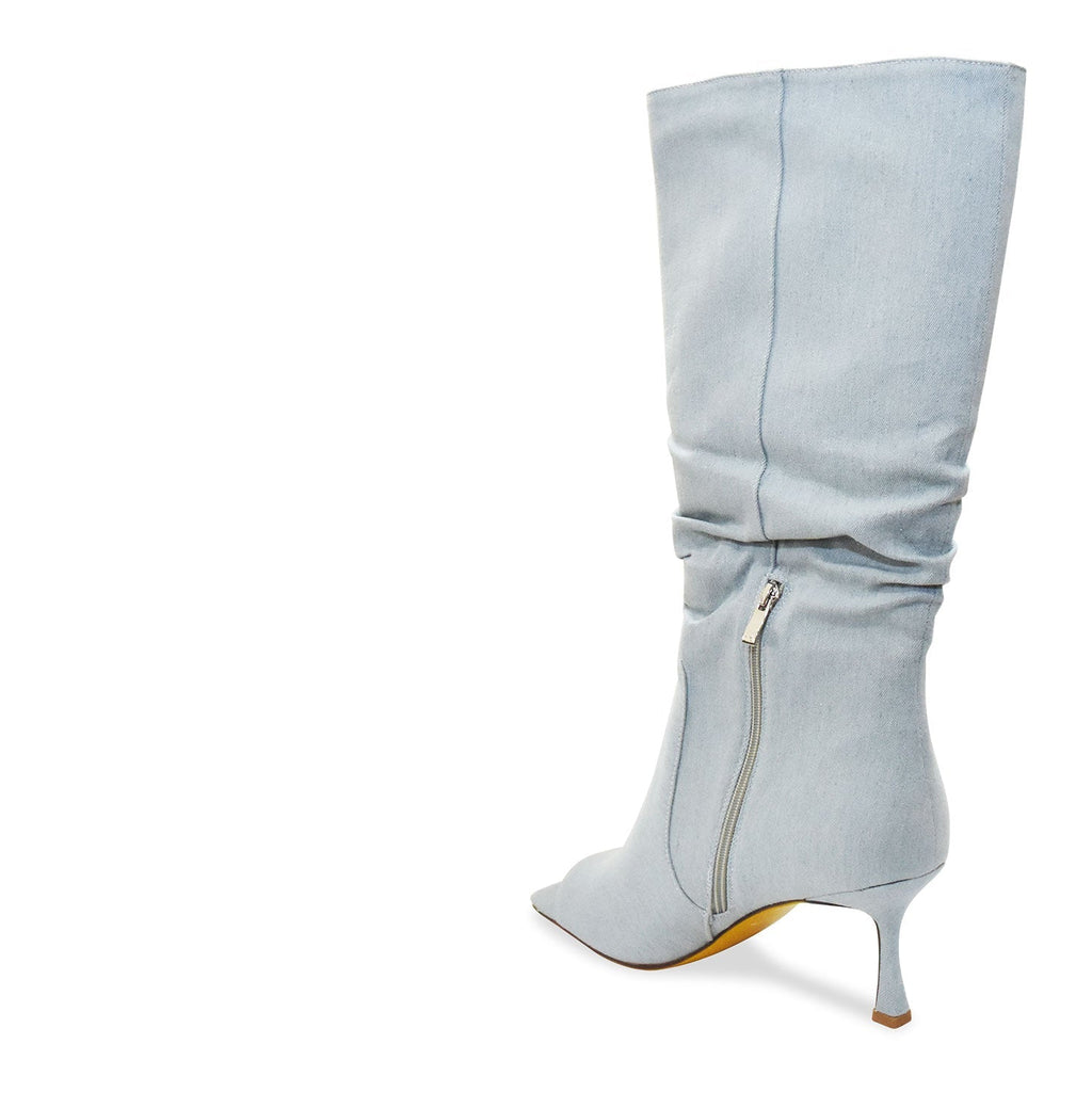 Stomp the yard in these pretty light denim boots. These heels were made for walking, and these boots certainly were too. With a subtle wrinkle effect, you can't go wrong in making these a messy style. Perfect for dates out, or days in.