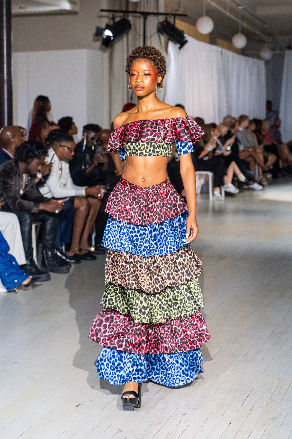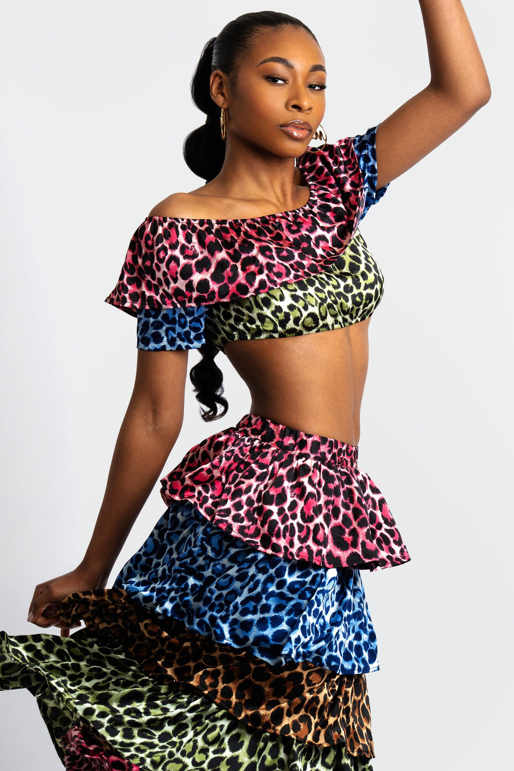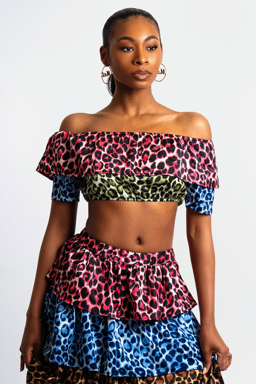 Featuring an off-the-shoulder crop top with cascading ruffles and a tiered maxi skirt that flows with every step, this set blends effortless drama with high-impact style. Its vibrant leopard patchwork in pink, blue, green, and tan creates a striking contrast, while the lightweight, breathable fabric makes it perfect for spring and summer. Unapologetically bold and effortlessly chic, this look is made to turn heads.