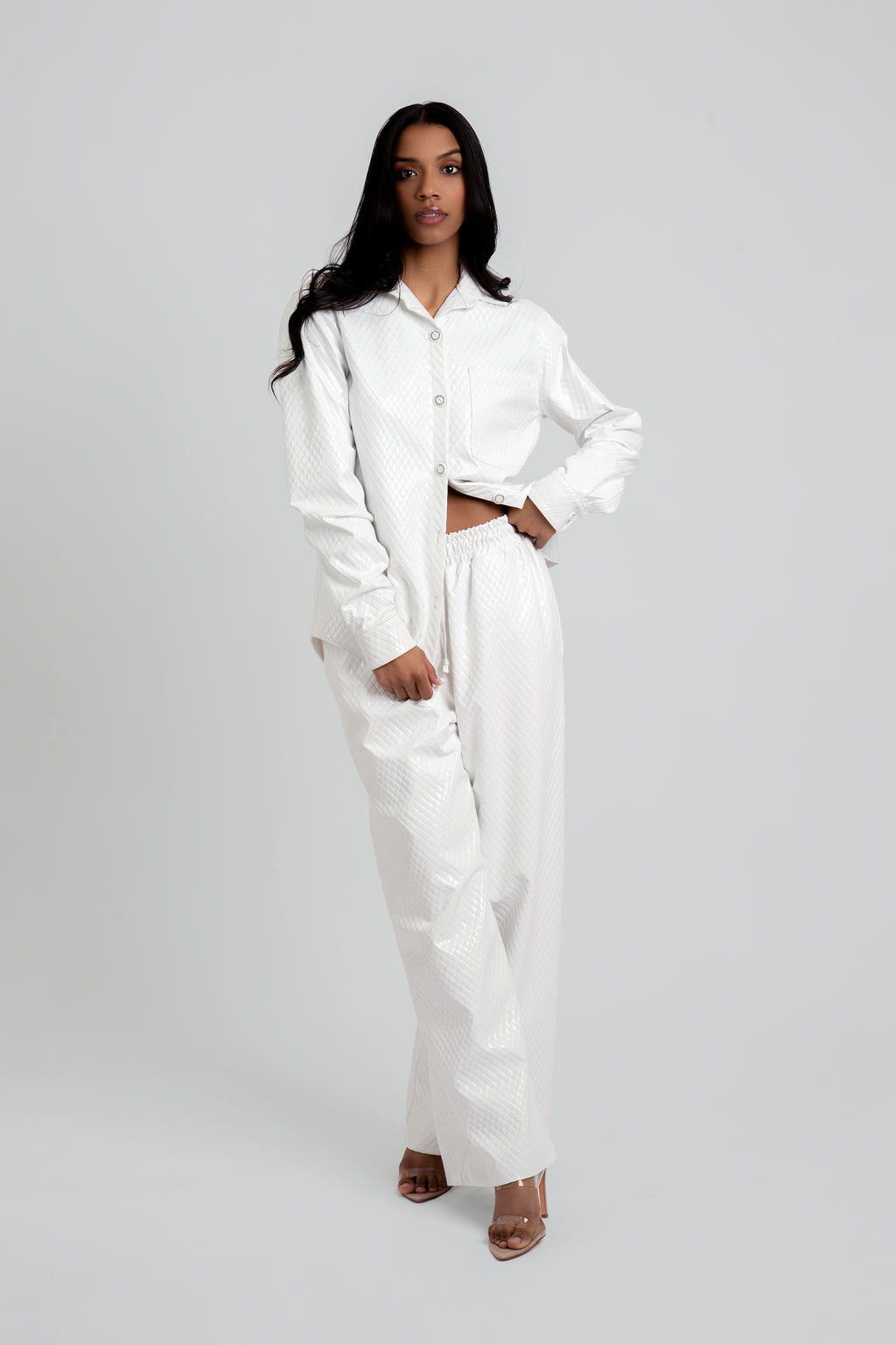 The Celeste Button-Up is crafted from quilted vegan leather for a luxe, modern aesthetic, available in white or red. Featuring crystal buttons for a touch of glamour, this statement piece is Made in the USA and designed to turn heads.