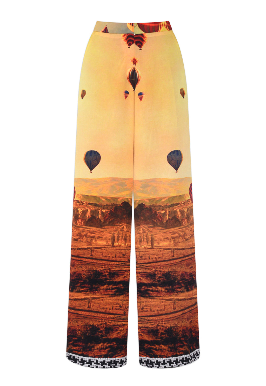 Imagine yourself floating through the clouds as you span the Cappadocia landscape in a hot air balloon, gliding above the famous "fairy chimneys." That is precisely what the warm-toned reds, yellows, browns, and oranges of the Alma print convey. The Cielo pants have a houndstooth hem, and the waistline is held in place by a zipper and clasp. Complement with any of the Alma Print matching merchandise.
