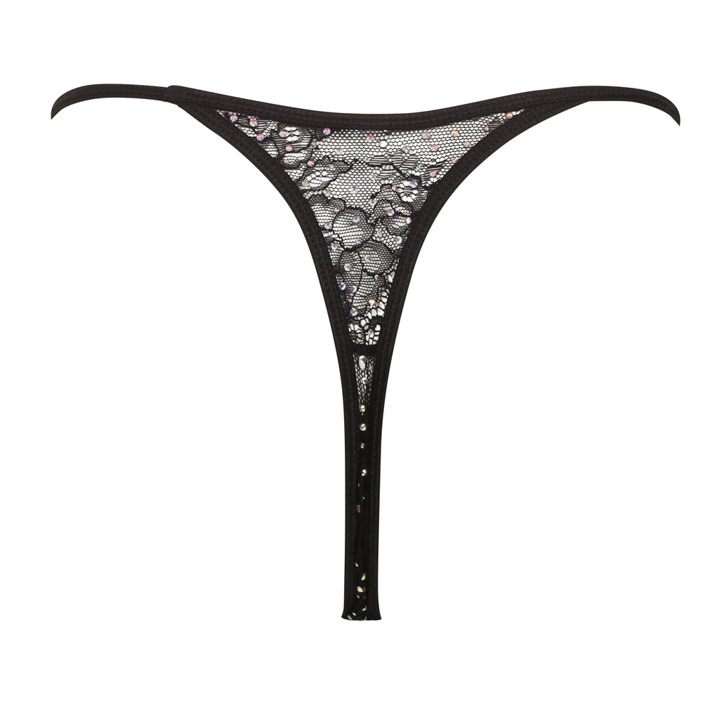 Black crystallized lace thong with string sides embellished with Crystal AB crystals.