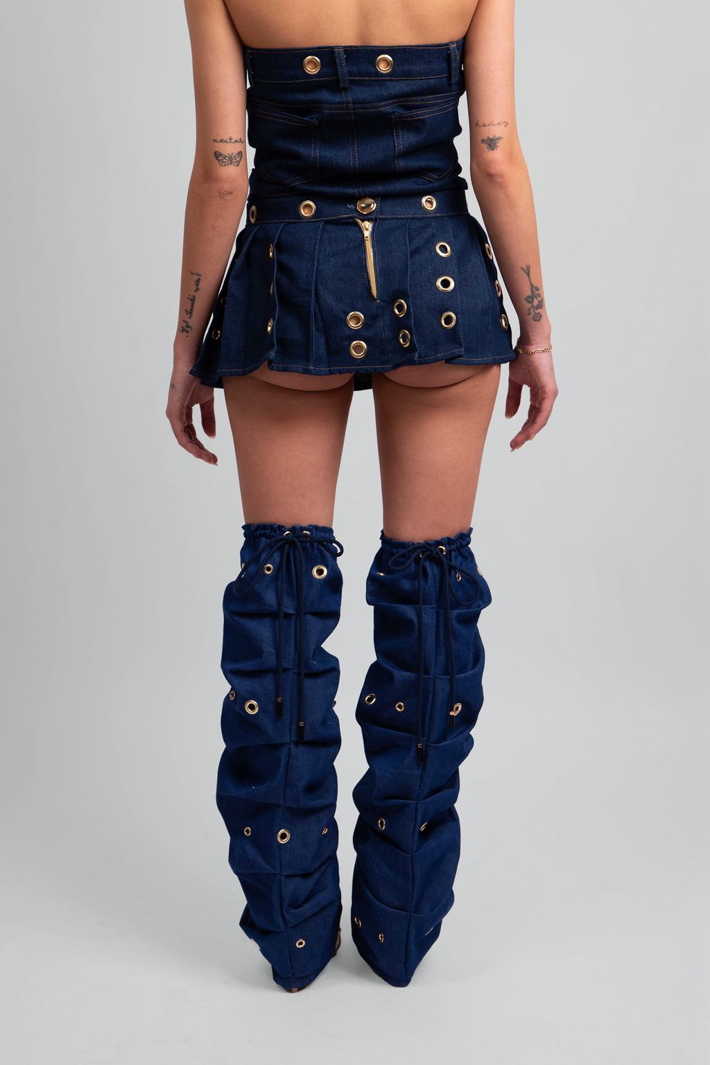 The Destiny knee-length leg warmers feature dark blue denim with stylish brass grommets. The drawstring cinch allows for a secure and adjustable fit, while the high-quality cotton blend provides durability and comfort. These leg warmers are the perfect addition to any denim shorts or skirt outfits.