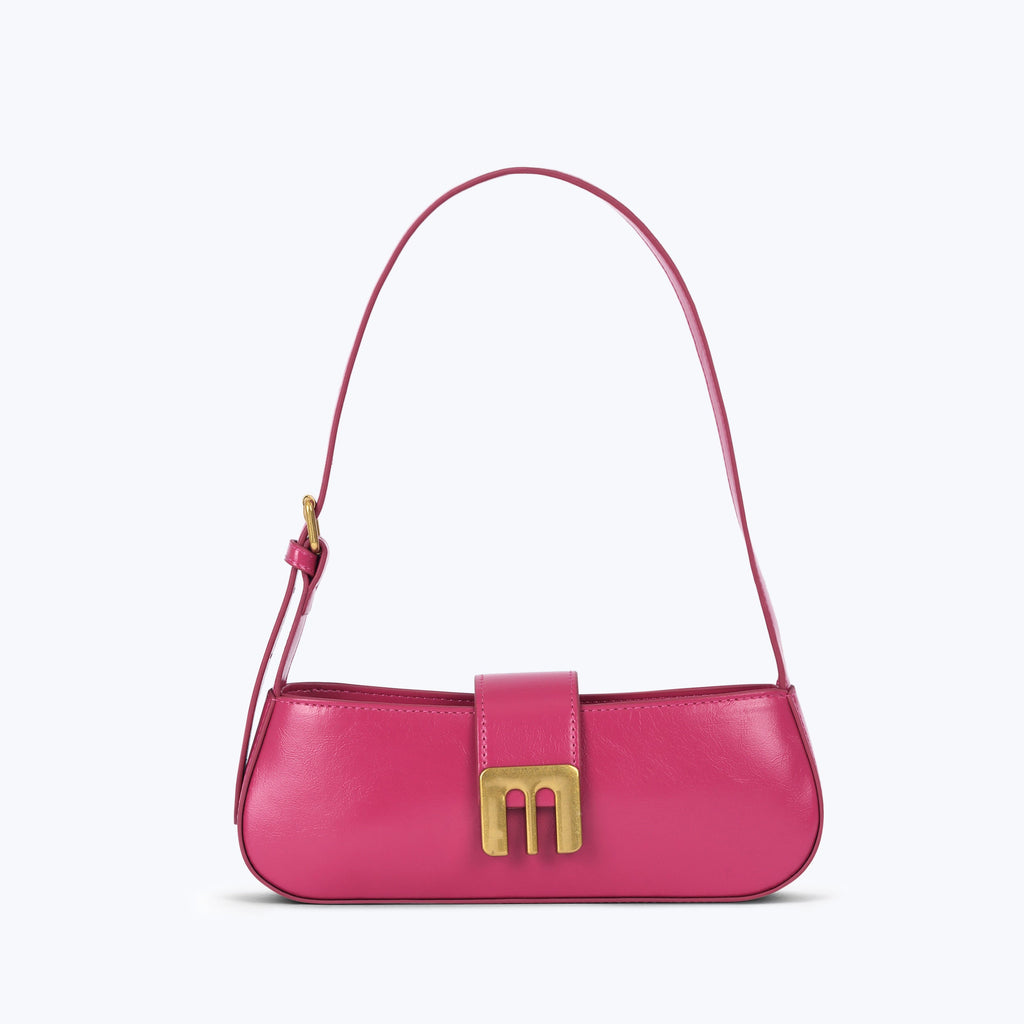 The Gabby bag features the recognizable M motif, brass hardware, and a sleek silhouette. This is a small bag made with oily vegan leather. The Gabby bag carries an iPhone and other small essentials making it perfect for a special night out or everyday use.