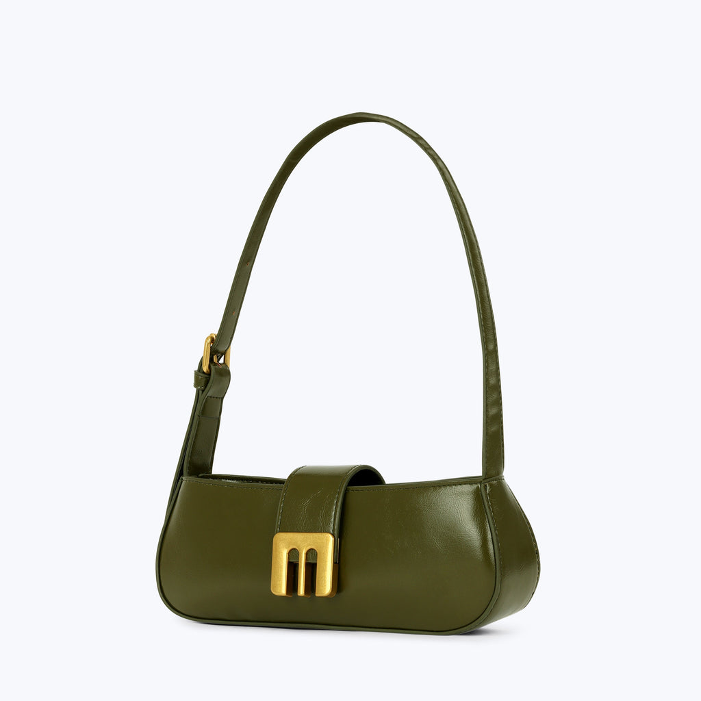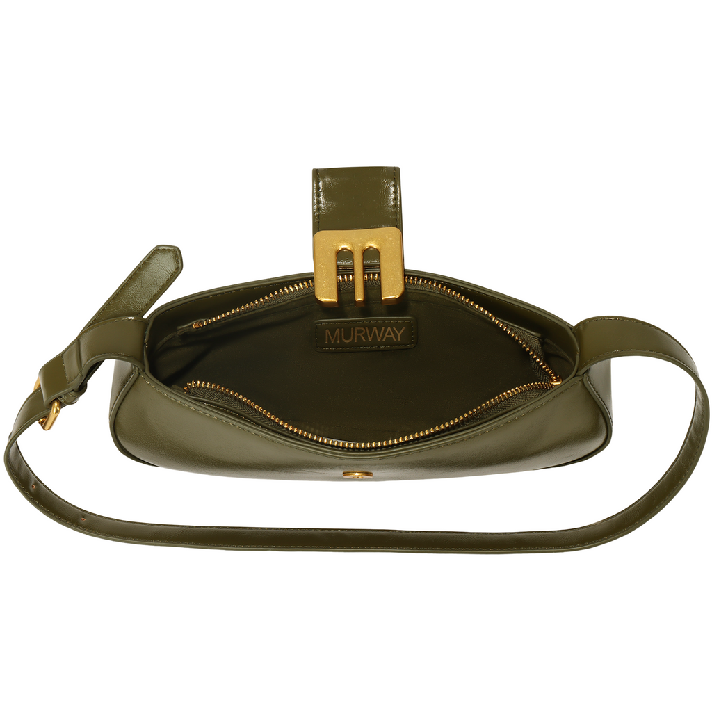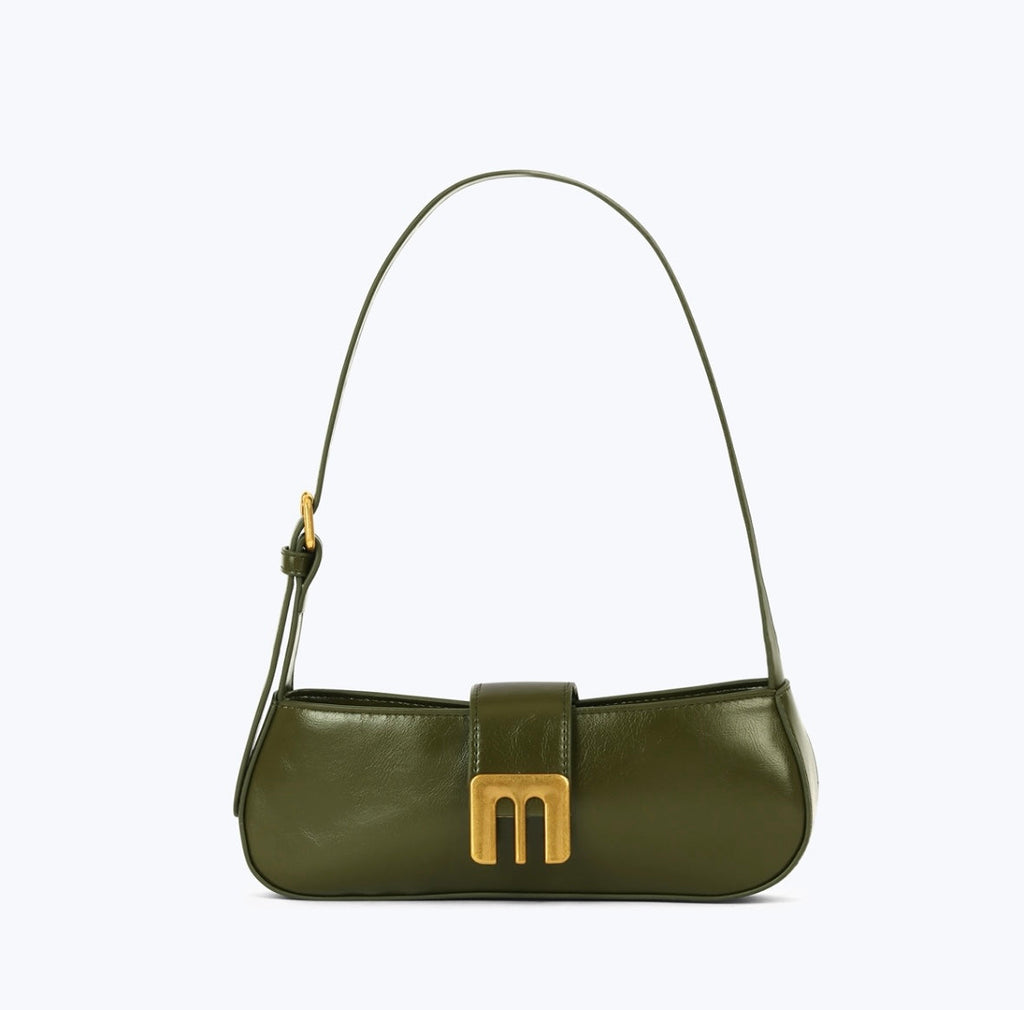 The Gabby bag features the recognizable M motif, brass hardware, and a sleek silhouette. This is a small bag made with oily vegan leather. The Gabby bag carries an iPhone and other small essentials making it perfect for a special night out or everyday use.
