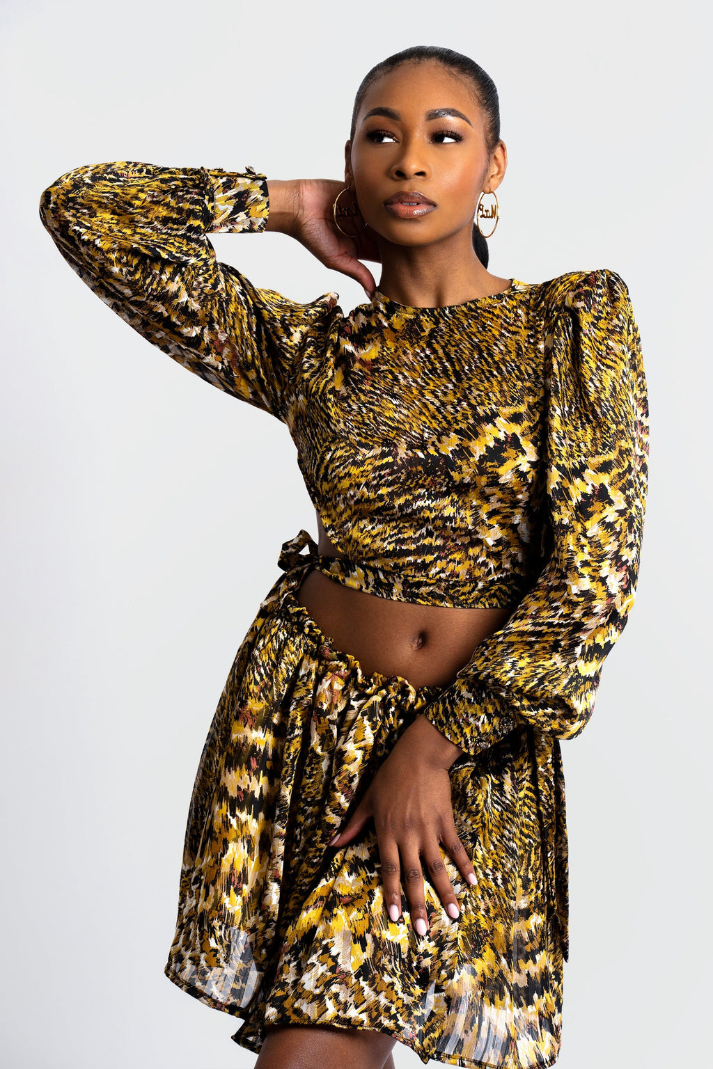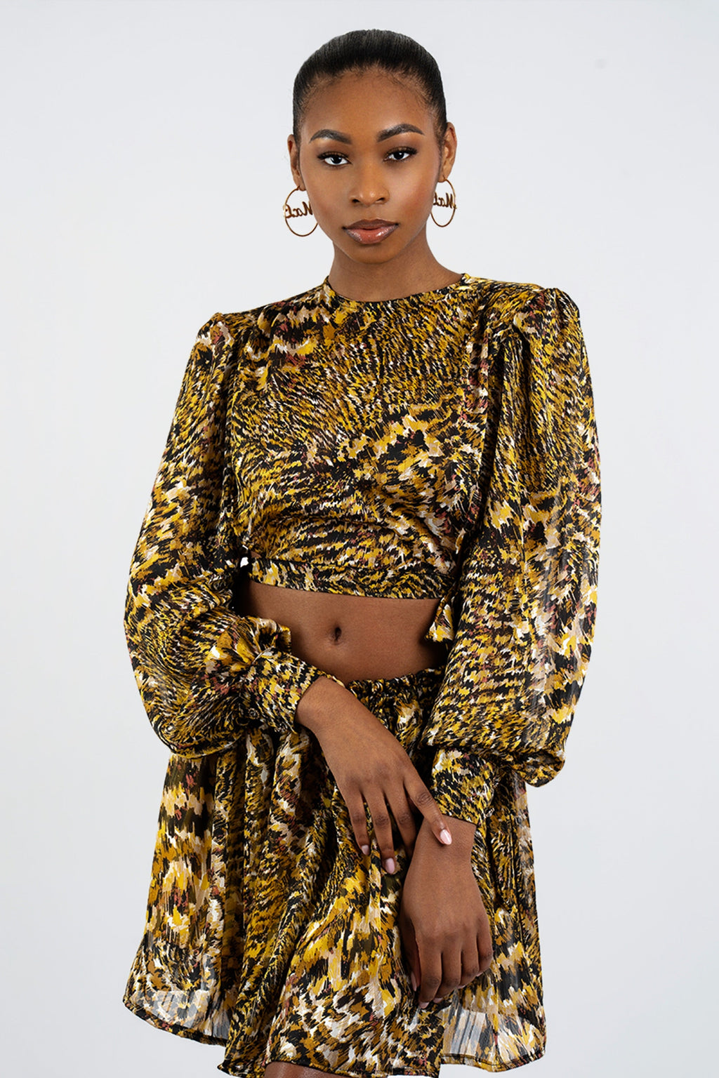 Crafted from lightweight fabric, this two-piece ensemble features a long-sleeve crop top with voluminous shoulders that create a sculptural yet relaxed drape. The high-waisted skirt complements the top with soft pleating, adding movement and dimension to the design. The intricate abstract pattern, a fusion of golden yellows, rich browns, and deep blacks, mimics the wild beauty of nature.