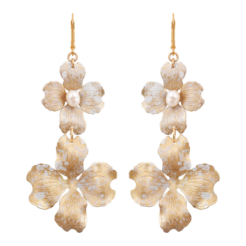 Brass blooms are washed in white pigment and finished with pearl details in this stunningly fresh pair. Gold-plated lever backs. Nickel and lead free.