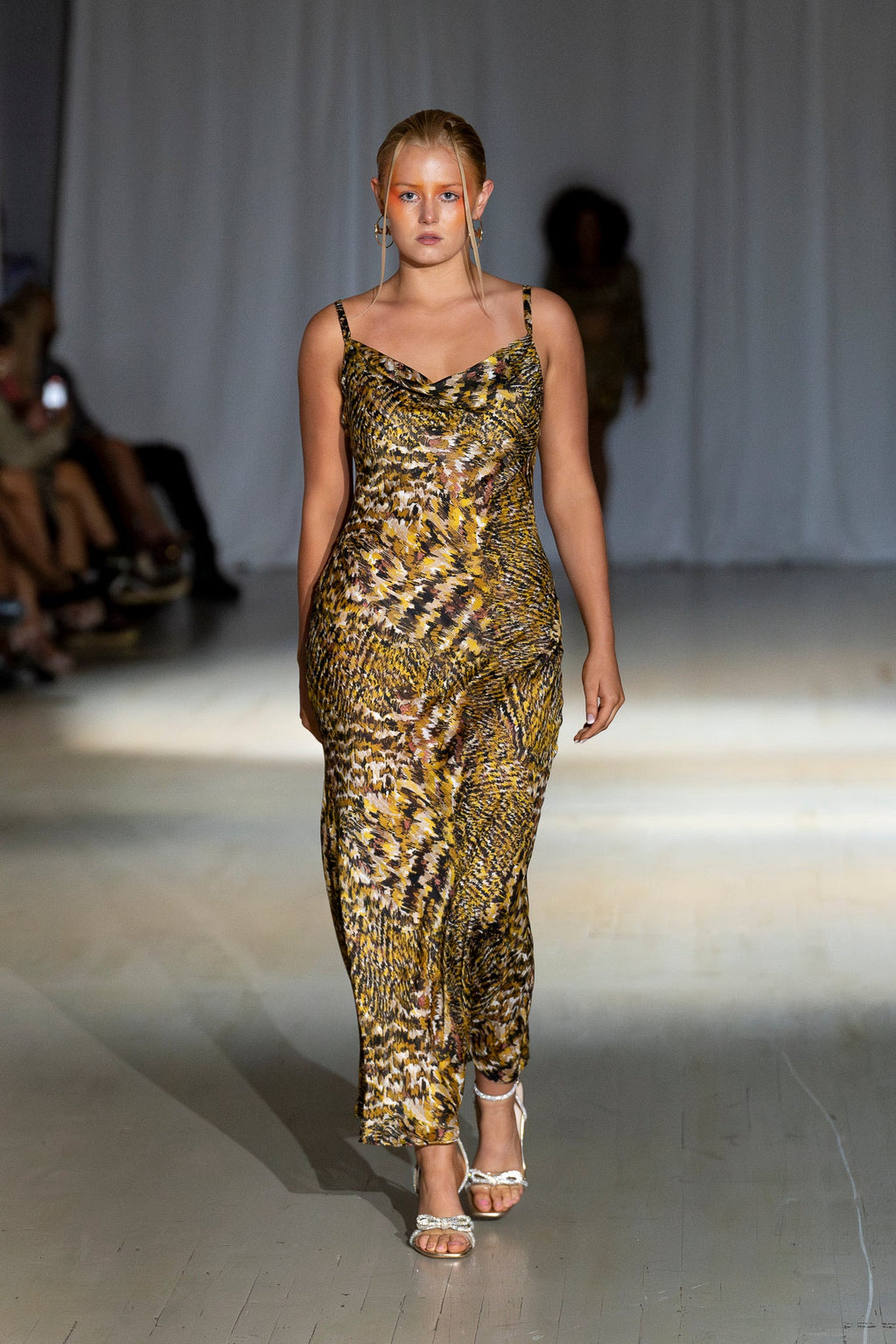 Designed with a bias-cut silhouette that skims the body, this luxurious fabric drapes naturally, enhancing movement with every step. A soft cowl neckline adds a touch of refinement, while delicate spaghetti straps frame the shoulders for a barely-there allure. The print is an electrifying fusion of gold, black, and earthy tones, evoking the raw beauty of the wilderness, transforming classic slip dress minimalism into a bold statement.