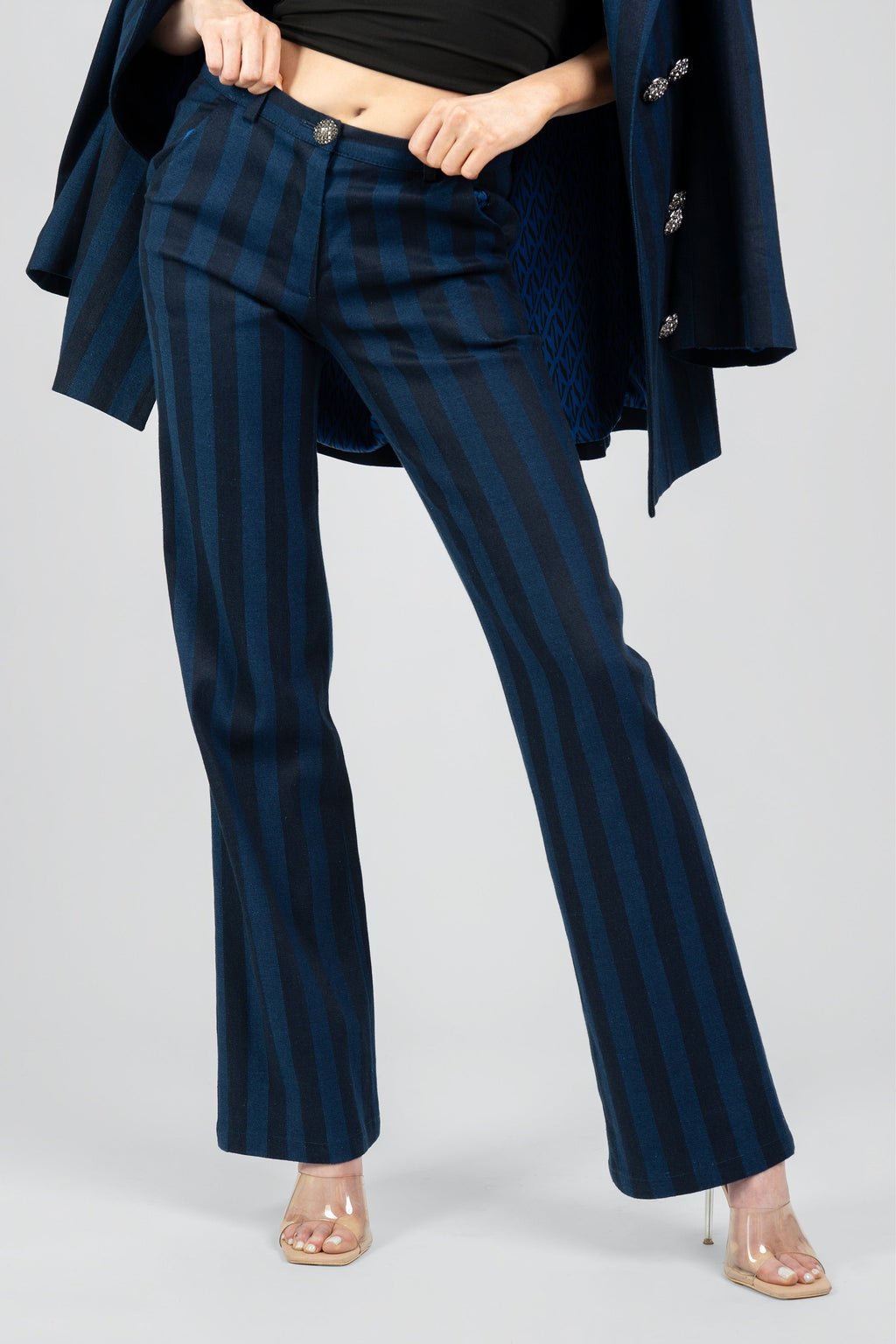 The Ramona Striped Pants redefine modern sophistication with their sleek, tailored design. Crafted from premium fabric, these pants feature a timeless silhouette that transitions seamlessly from day to night. The muted stripe pattern adds a touch of subtle class. Fresh from their NYFW debut, the Ramona Striped Pants are perfect for those who value effortless style with a contemporary twist. Pair them with a crisp blouse or The Ramona Striped Long Blazer to complete the look.