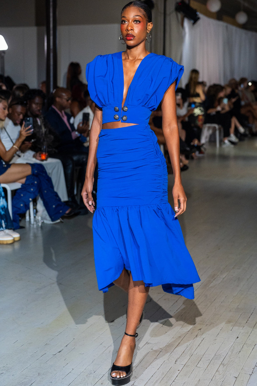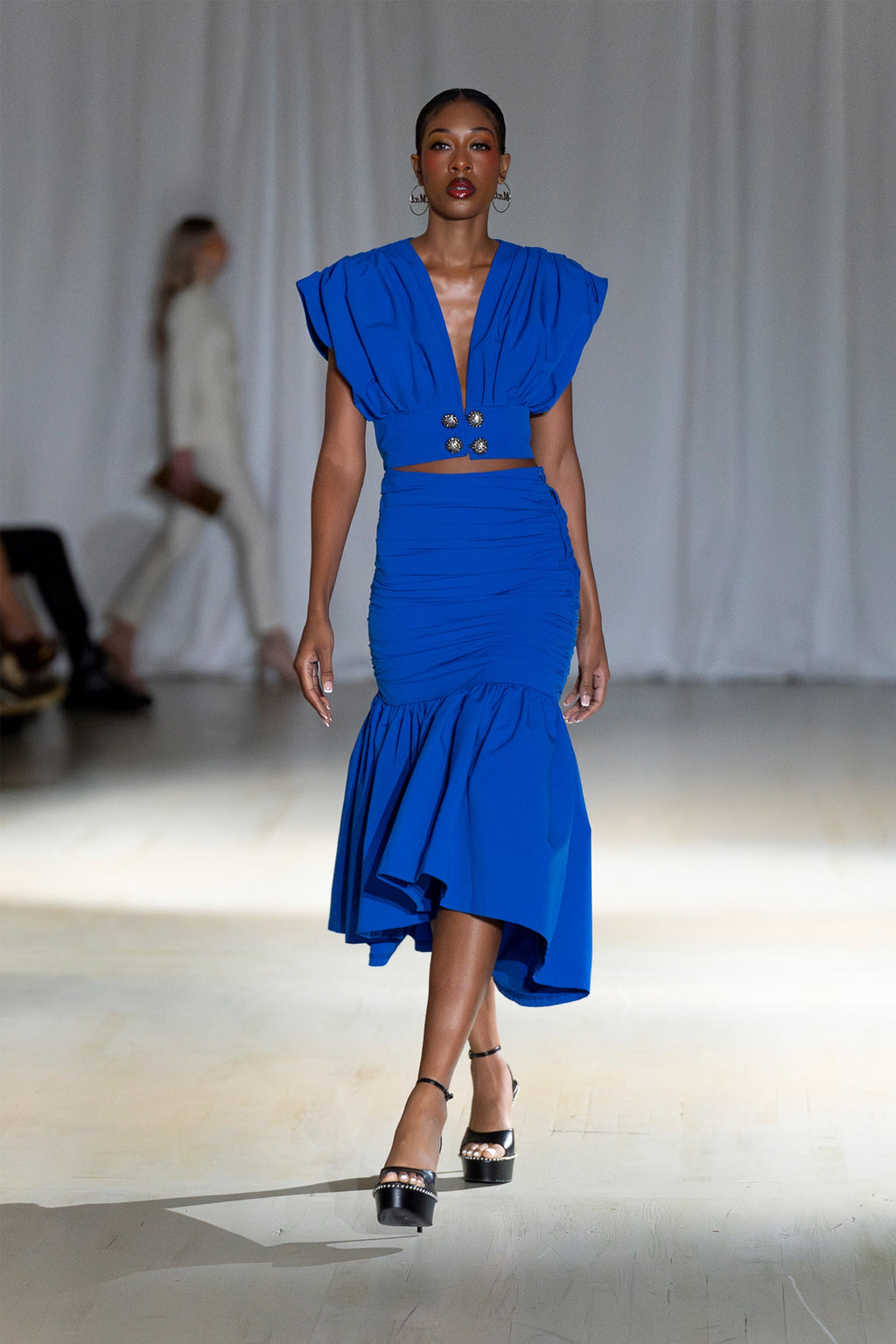 The high-waisted skirt is meticulously ruched throughout, amplifying texture and shaping the form. The construction leads into an asymmetrical ruffled hem, where the volume is released into an organic, flounced finish.