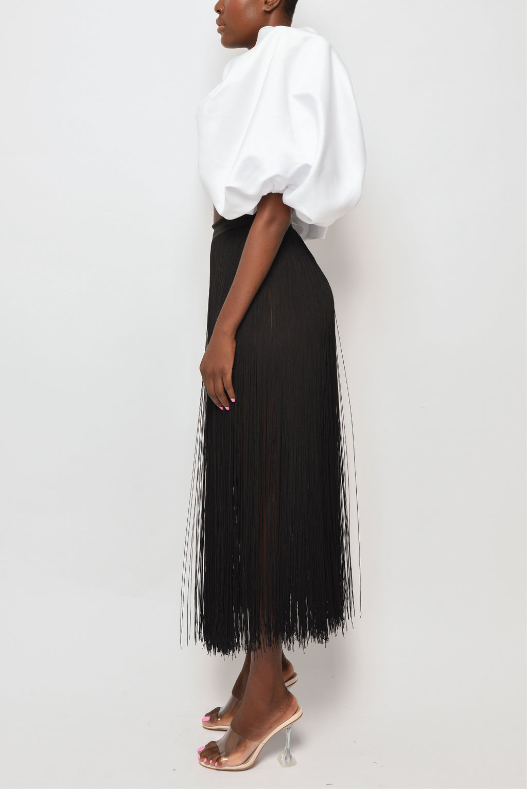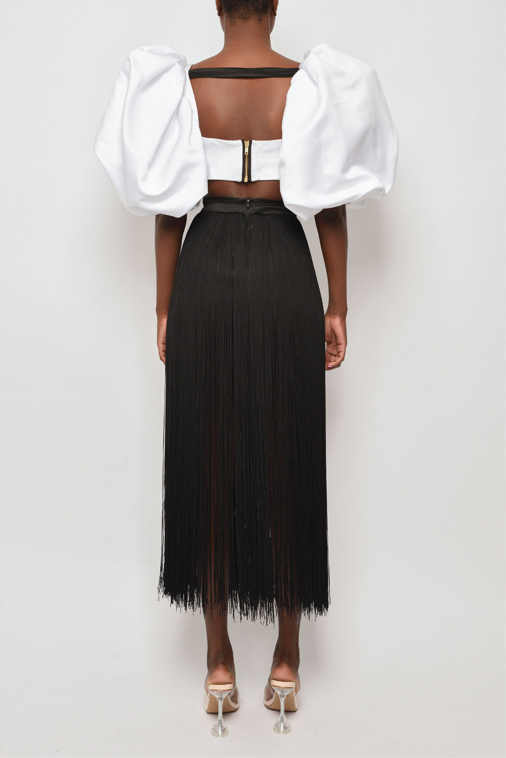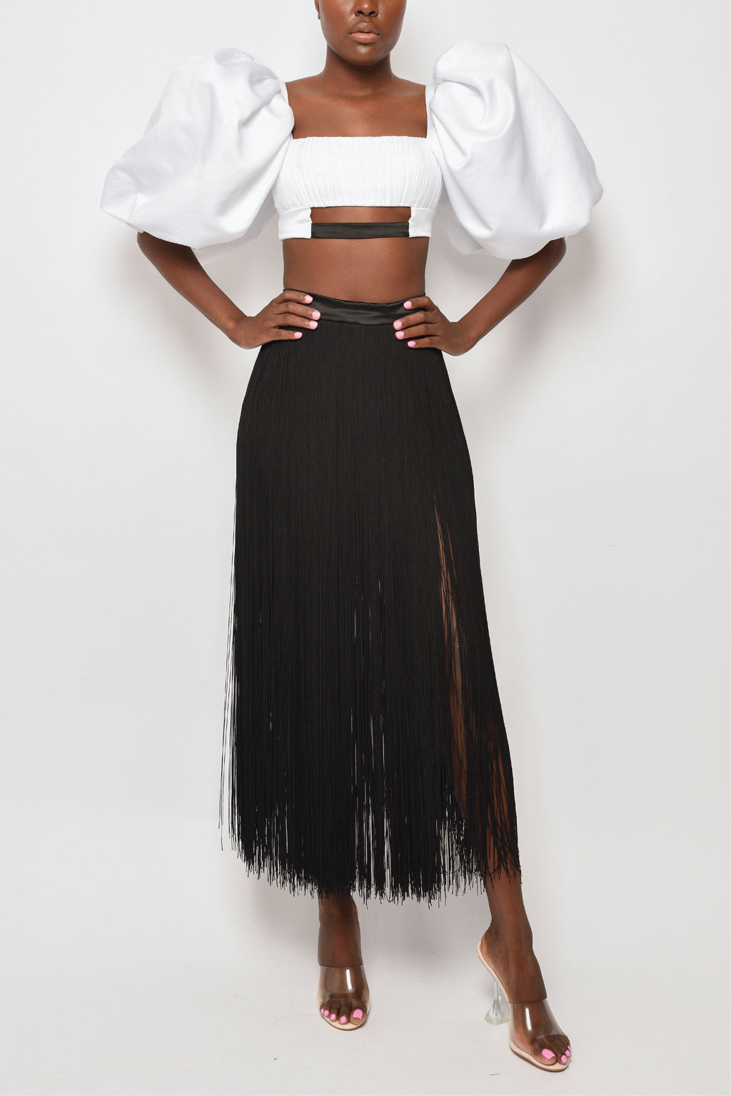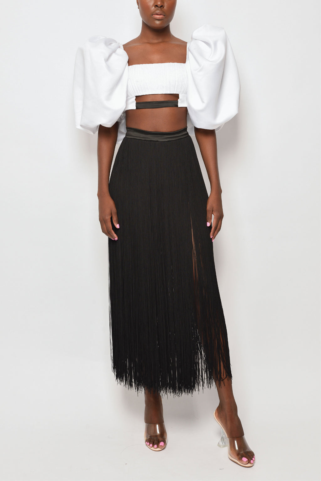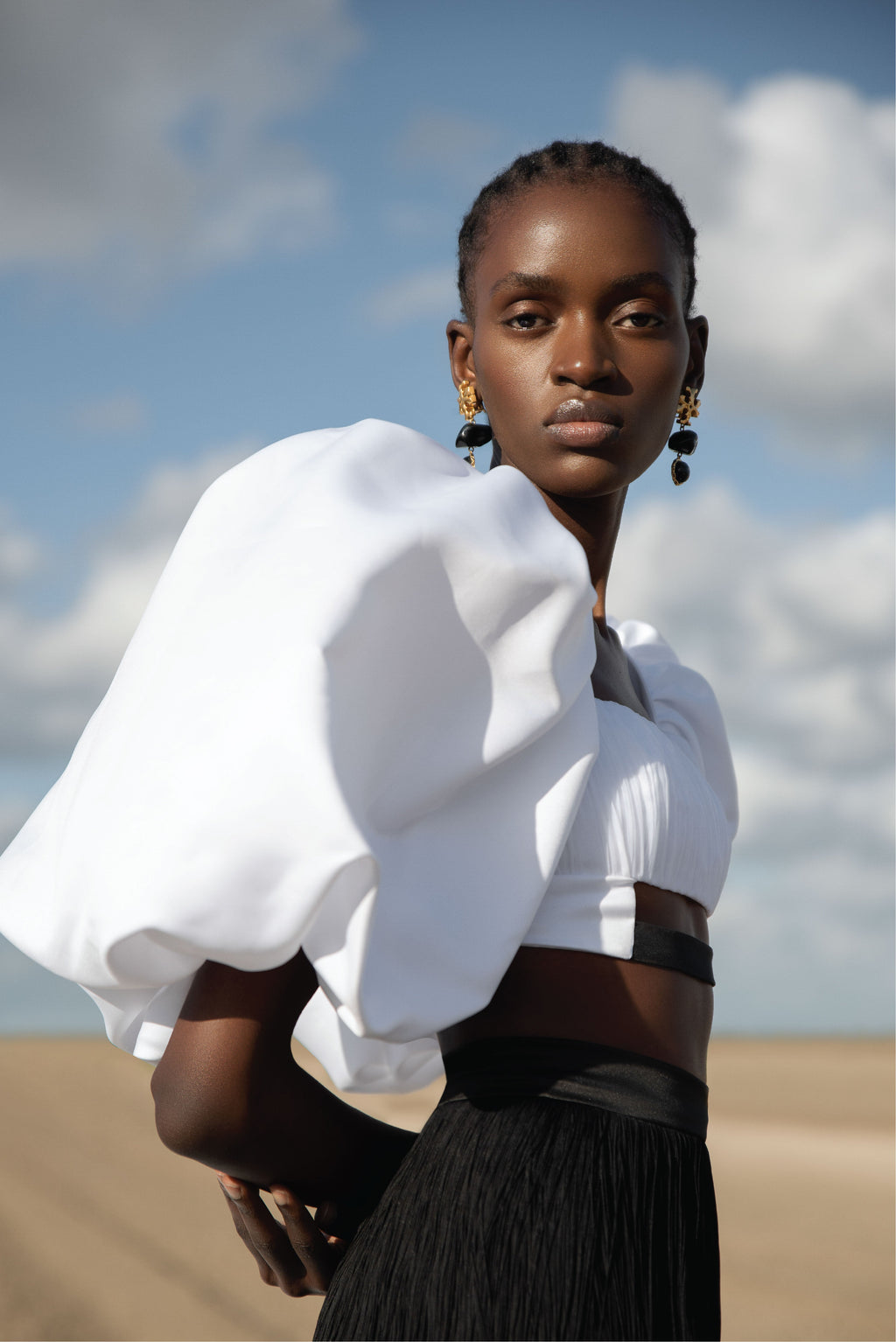 Aerin wears our Ifama short sleeve crop top featuring voluminous puff sleeves with a square neckline, and pleated panel in front.
